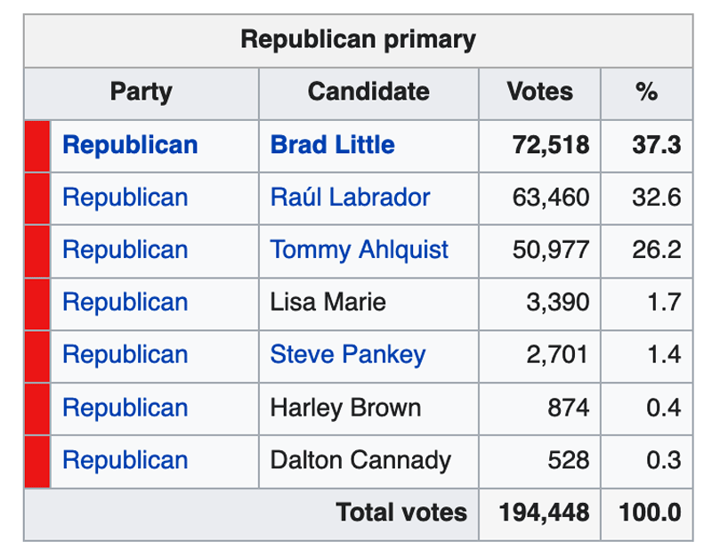 In fact, 114,437 Idahoans voted against Brad Little in 2018 while only 72,518 voted for him. That means 58.8% of Idaho Republicans voted against Brad Little, but Tommy Ahlquist ensured that enough conservative votes got siphoned away from Raul Labrador and ended up handing the race to Brad Little. Sadly, only Raul Labrador had a proven track record as a conservative Republican. Tommy was just a wannabe.