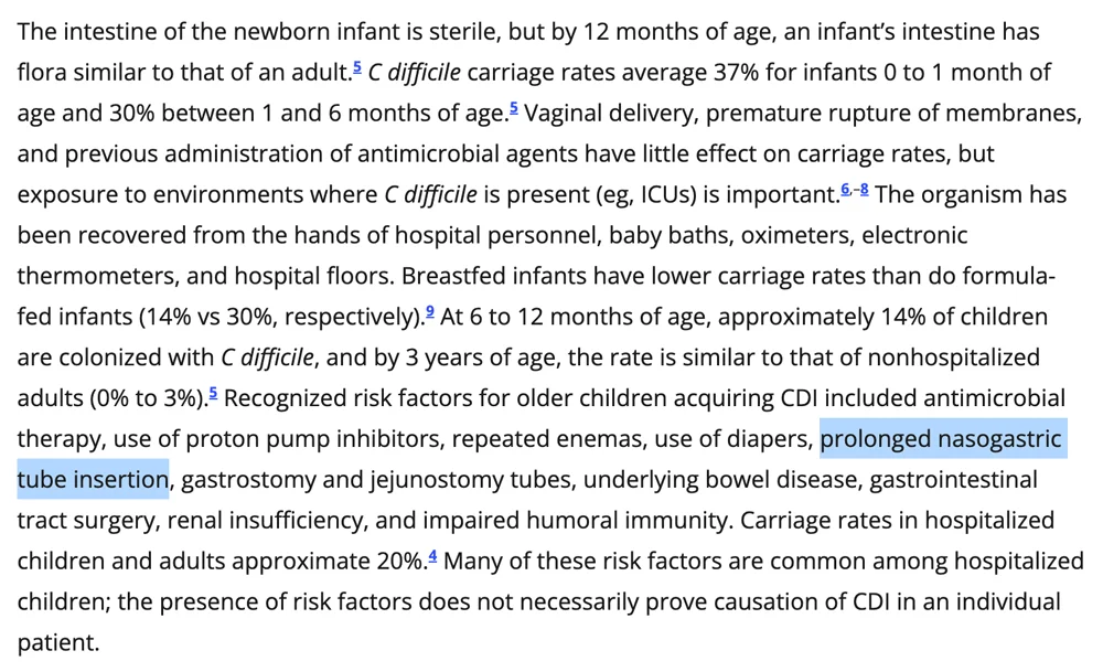 Most specifically, we were originally concerned when Baby Cyrus’s forced NG tube (that St. Luke’s forced in him) fell out, and according to the “safety plan” that the Idaho Department of Health and Welfare (IDHW) made us agree to in order to get Baby Cyrus back, we had to return to the IDHW for them to put the NG tube back in. The nurse, Tracy Jungman, literally just grabbed the tube, which had been flopping around touching things and getting dirty, and shoved it back into this nose and down into his stomach. She didn’t wear gloves, she didn’t sanitize the tube, and she didn’t switch the tube out for a new one, or anything that would seem obvious for sanitary purposes. We expressed our concern and she just played it off as if it was nothing. According to the American Association of Pediatrics, prolonged use of an NG tube is a common cause of C.DIFF. infection: