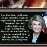 Original content from Senator Nancy Schaefer (aka Nancy Schafer, Shafer) Nancy Schaefer was a Georgia State Senator, from 2004-2008. Nancy was murdered on March 26th 2010. Her, and her Husband Bruce, both were shot. Their deaths were ruled a murder suicide, claiming Bruce took Nancy’s life and than his own. I have to question that, […]