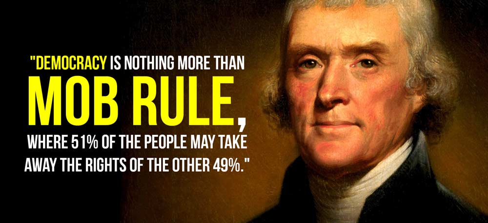 In a true and direct democracy, the majority vote on any subject wins. Therefore, if the majority votes that you should be killed, then so be it! 51% can rule everything. That is direct democracy. Thomas Jefferson famously stated, “Democracy is nothing more than mob rule, where 51% of the people may take away the rights of the other 49%.”