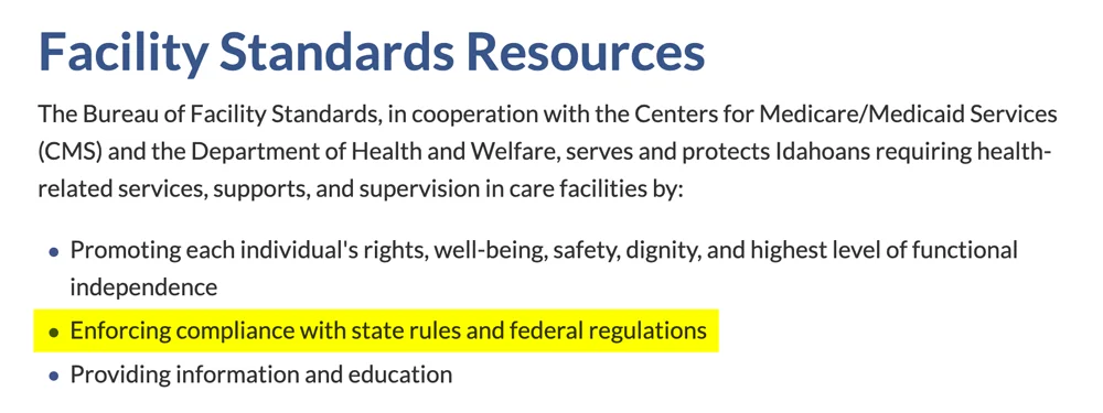 In the state of Idaho, the department responsible for this is “Facility Standards” at the Idaho Department of Health and Welfare. As you can see in the screenshot below, “Facility Standards” is responsible for “Enforcing compliance with state rules and federal regulations.” This is important because if all the boxes aren’t checked and states (like Idaho) are not properly following the rules established by the ASFA law, then Idaho won’t get money for kidnapping children.