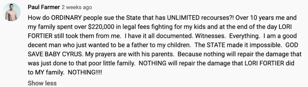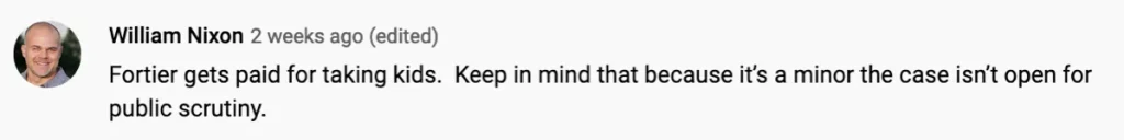 2. Levi and Marissa had an attorney go with them into the court hearing and the clerk mentioned that in the 2 years she had worked there, she had “never once seen parents go to a shelter care hearing with an actual attorney.” That means the deck is stacked against most parents who have had their children kidnapped. They are not getting any legal help and are therefore easy to abuse. Laurie Fortier, and the entire system in general, are taking advantage of people this way.
