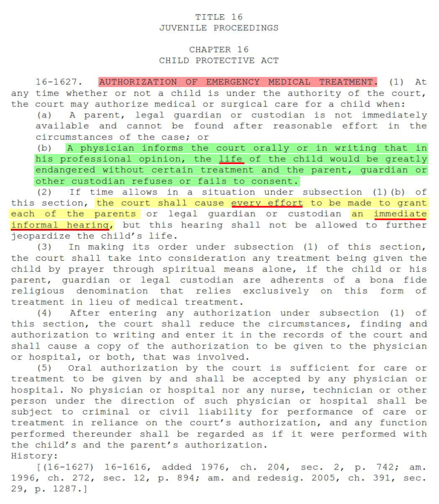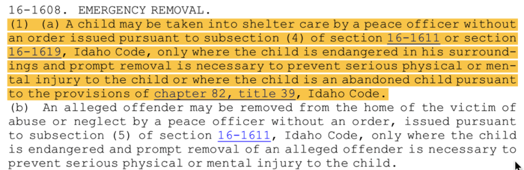 Idaho State Law requires that a child may only be taken from his family “where the child is endangered in his surroundings and prompt removal is necessary to prevent serious physical or mental injury to the child or where the child is an abandoned child.” Baby Cyrus was neither abandoned nor was any evidence ever provided which demonstrated that he was endangered had he not been “removed” from his parents physical custody. REMEMBER—they kidnapped Baby Cyrus! If they were concerned for his health and welfare, they could have allowed the parents to accompany Baby Cyrus to the hospital, which the video record demonstrates they were willing to do!