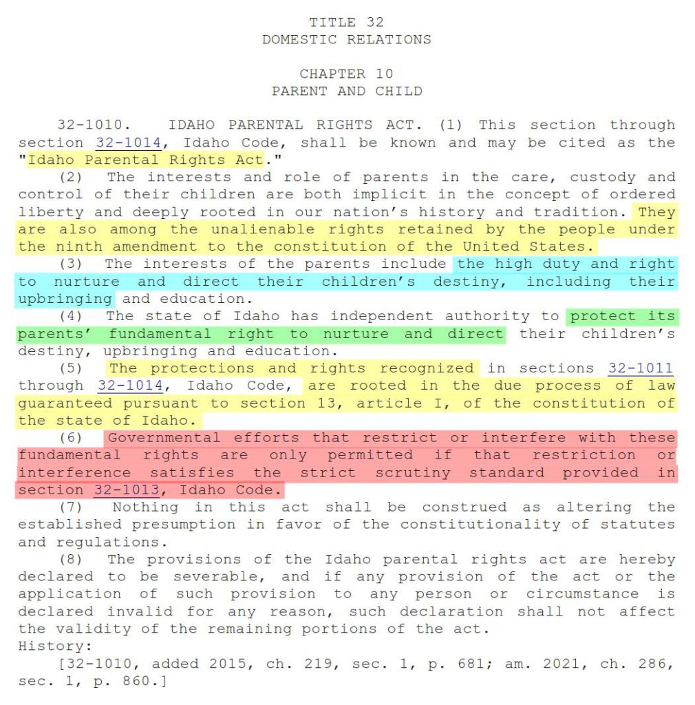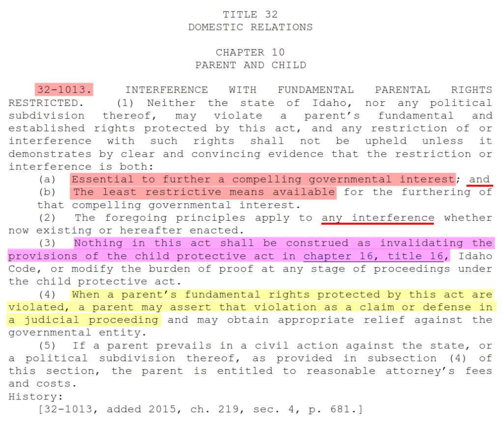 The Parental Rights Act was completely disregarded and disobeyed. Section 6 above notes that the Idaho State Government only has permission to interfere with Parental Rights if the “strict scrutiny standard” provided in Section 32-1013 is satisfied.