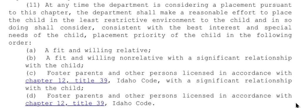 After Baby Cyrus was wrongfully kidnapped by the State of Idaho, he still should have been placed with a “fit and willing” relative according to this Idaho Statute. There were any of a number of fit and willing relatives or “fit and willing non relatives with a significant relationship with the child,” but the state made zero effort to place Baby Cyrus with any of them. They broke this law: