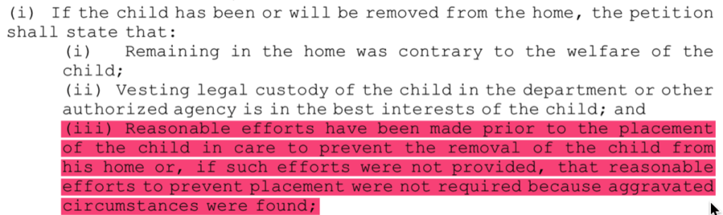 This law requires that the government provide PROOF that “reasonable efforts have been made prior to the placement of the child in care to prevent the removal of the child from his home.” Absolutely ZERO efforts were made and they even admit this in their own documentation which you can see below: