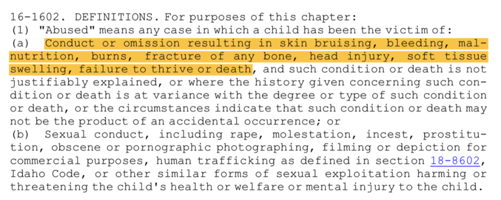 Idaho State Law requires that “abuse” be defined as something that was CAUSED by the parents through “conduct or omission.” Therefore if Levi and Marissa Anderson (Baby Cyrus’s parents) were to be charged with “abuse,” evidence would have to be shown which demonstrated that they were the cause of Baby Cyrus’s “failure to thrive.” Not a single shred of evidence was provided in the entire process.