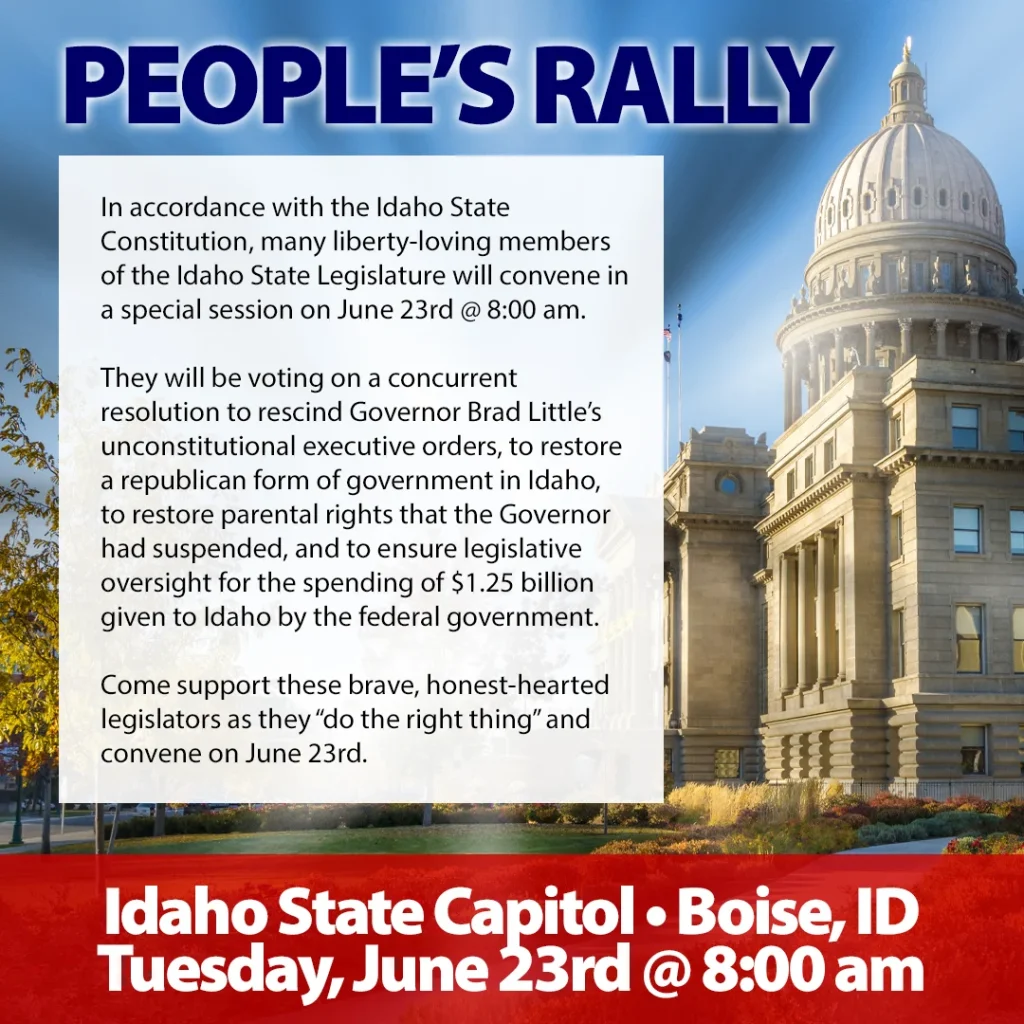 Additionally, please join with us at the Boise State Capitol on June 23rd at 8:00 am in support of all legislators who are trying to do their job and restore Constitutional Law in Idaho.